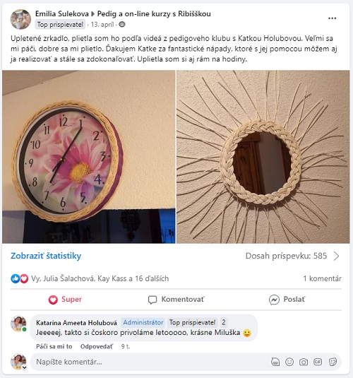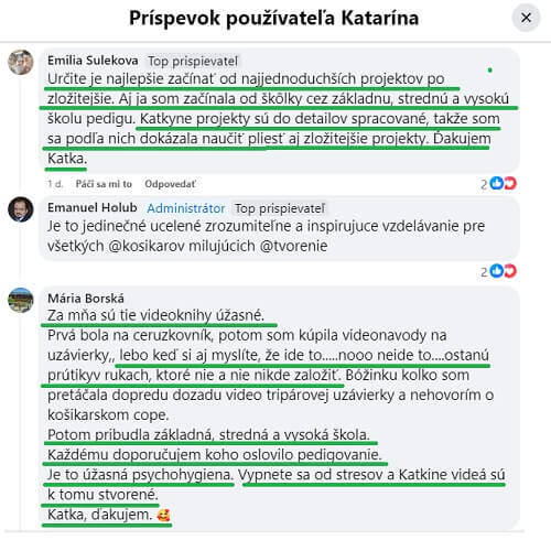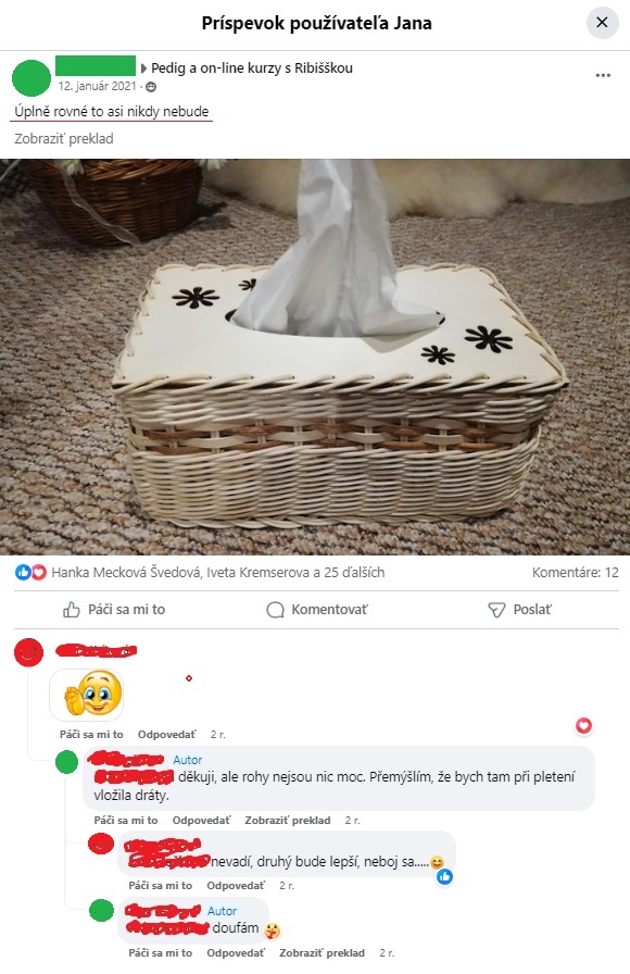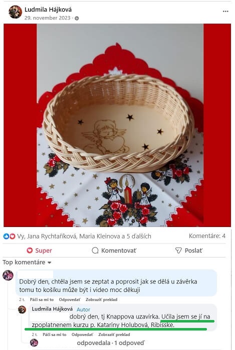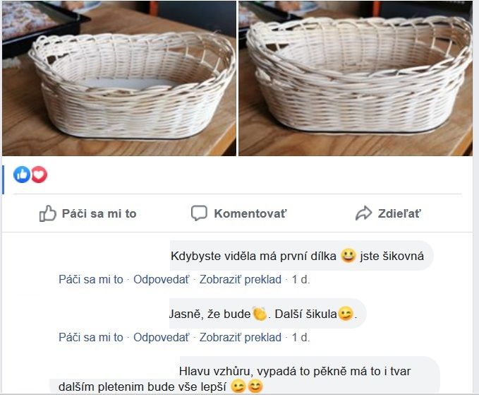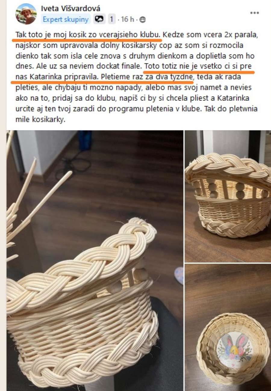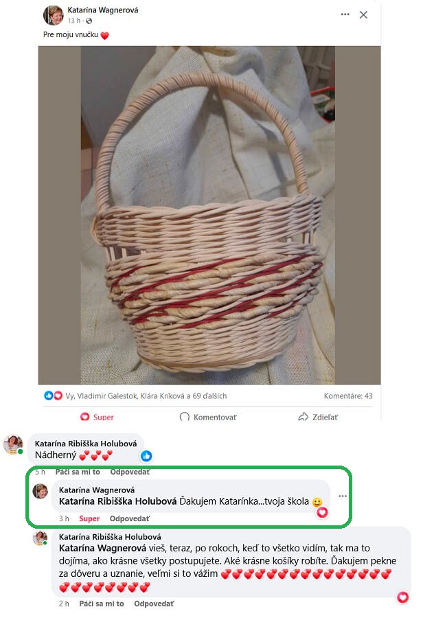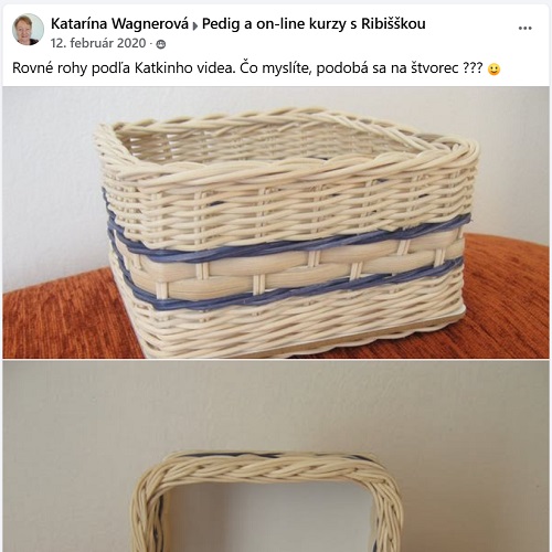 Je milé takéto povzbudzovanie, len s tým, že nikam nevedie. Nezlepší techniku a ani vedomie pletenia. Košikárka sa naháňa za skúšaním a už dostáva rady, že na budúce to bude pelšie.