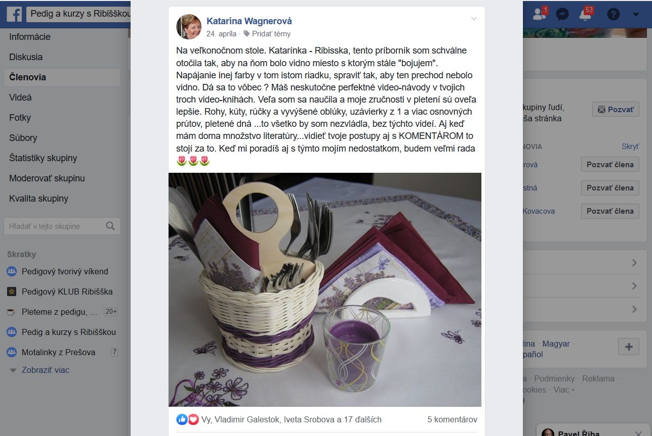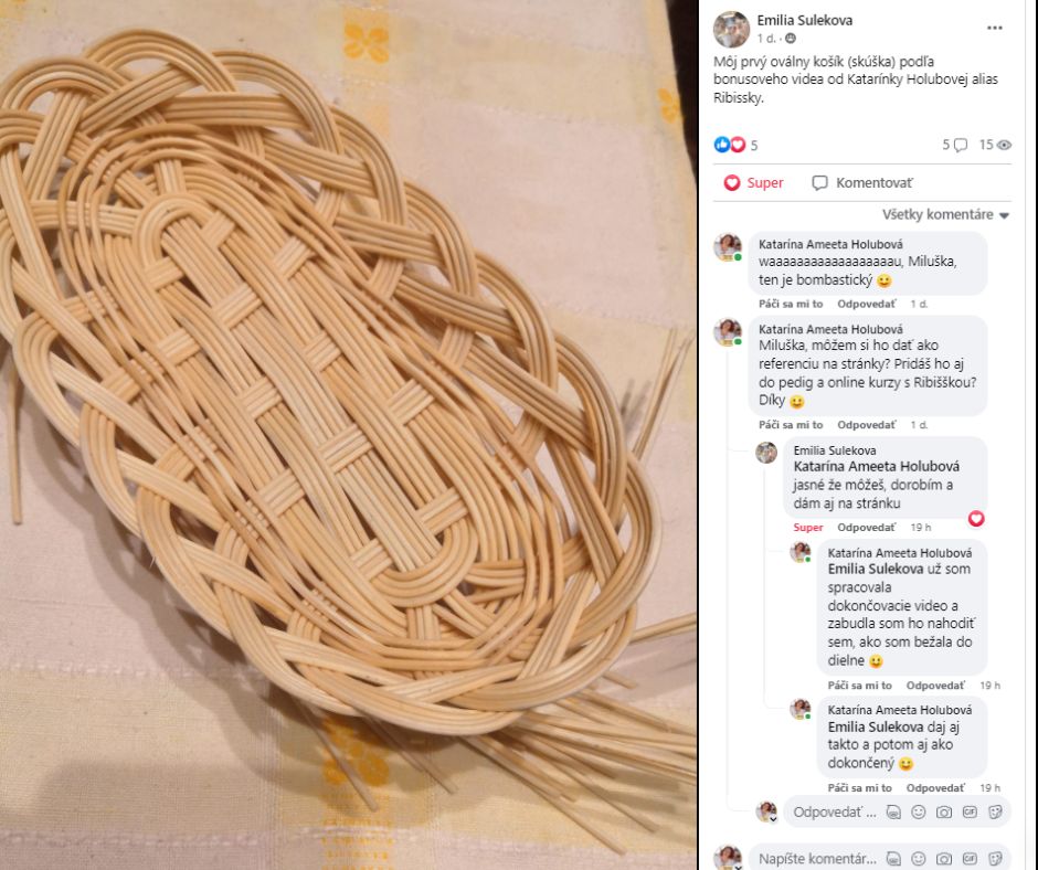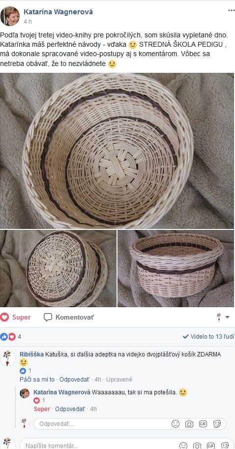 Tu sa pýta ďalšej samoukovskej košikárky, či jej natočí video, ako dosiahne pletenie kríženého vzoru. Ešte nemá poriasdne základy, ale už ide pliesť deklík, vzory a už vopred vie, že to nejde hneď. Tak vedz, že to všetko môže ísť hneď.Nie zo zvedavosti, ale ako krásne ucelené remeslo.