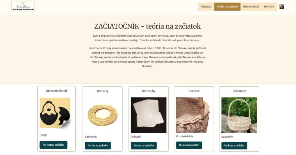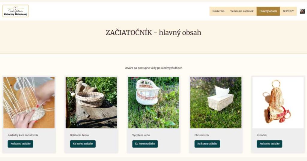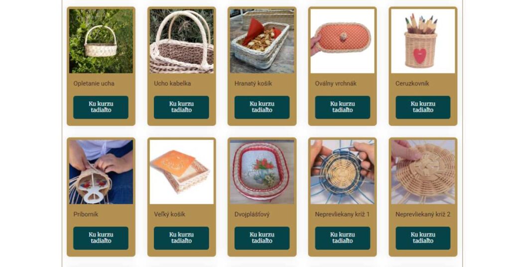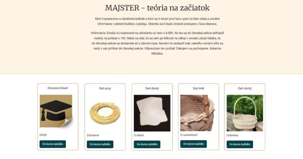 6 týždňov mojej plnej podpory, nových informácií, techník a košikárskych technológií. Obsah má podobu videí, obrázkov a textov s rozpismi materiálov k daným kurzom. Kurzy sú prevažne dabované pomocnými informáciami, ktoré ťa počas pletenia vedú tak, aby si svoj košík dokázala ľahko a hladko zdárne dokončiť. Pri opakovaných úkonoch je vo videu hudba. Pri náročnejších častiach návodu je video spomalené a priblížené tak, aby si podľa neho aj túto časť pletenia dokonale zvládla. Cena 370,00 €ur