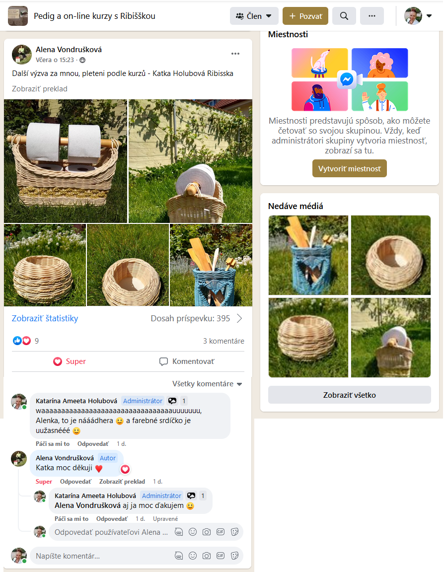 Krásný den, děkuji za skvělé vedení při prvním pletení košíčku. Chystala jsem se k tomu již dlouho, ale vy jste mě nastartovala s činností. Kurz byl srozumitelný, nebyl dlouhý a už mám upletené 3. Moc děkuji za základy na kterých se dá stavět. Jarka Š 💗💗💗